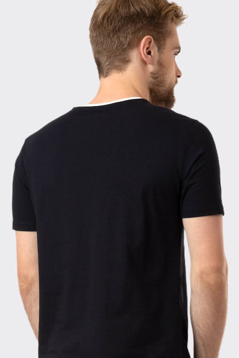 Camiseta feita em malha algodão, com modelagem básica e manga curta. Esta peça tem um corte tradicional, mais solta, comprida e gola arredondada com acabamento em ribana.